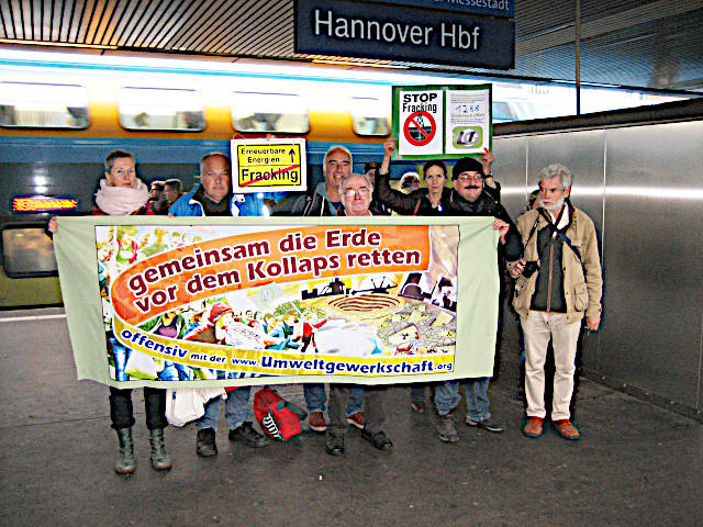 „Die ‚Umweltgewerkschaft Bremen/Oldenburg‘ hat am 24. Oktober 2018 in Hannover 1.288 Unterschriften an das niedersächsische Umweltministerium übergeben. Mit ihren Unterschriften haben die Bürgerinnen und Bürger den geplanten neuen Erdgasbohrungen von DEA im Wasserschutzgebiet Panzenberg bei Verden eine klare Absage erteilt. Die Gasförderung mit hochgiftigen Cemikalien ist eine tickende Zeitbombe. Wissenschaftliche Untersuchungen belegen den direkten Zusammenhang zwischen Erdgasbohren und erhöhten Krebserkrankungen.