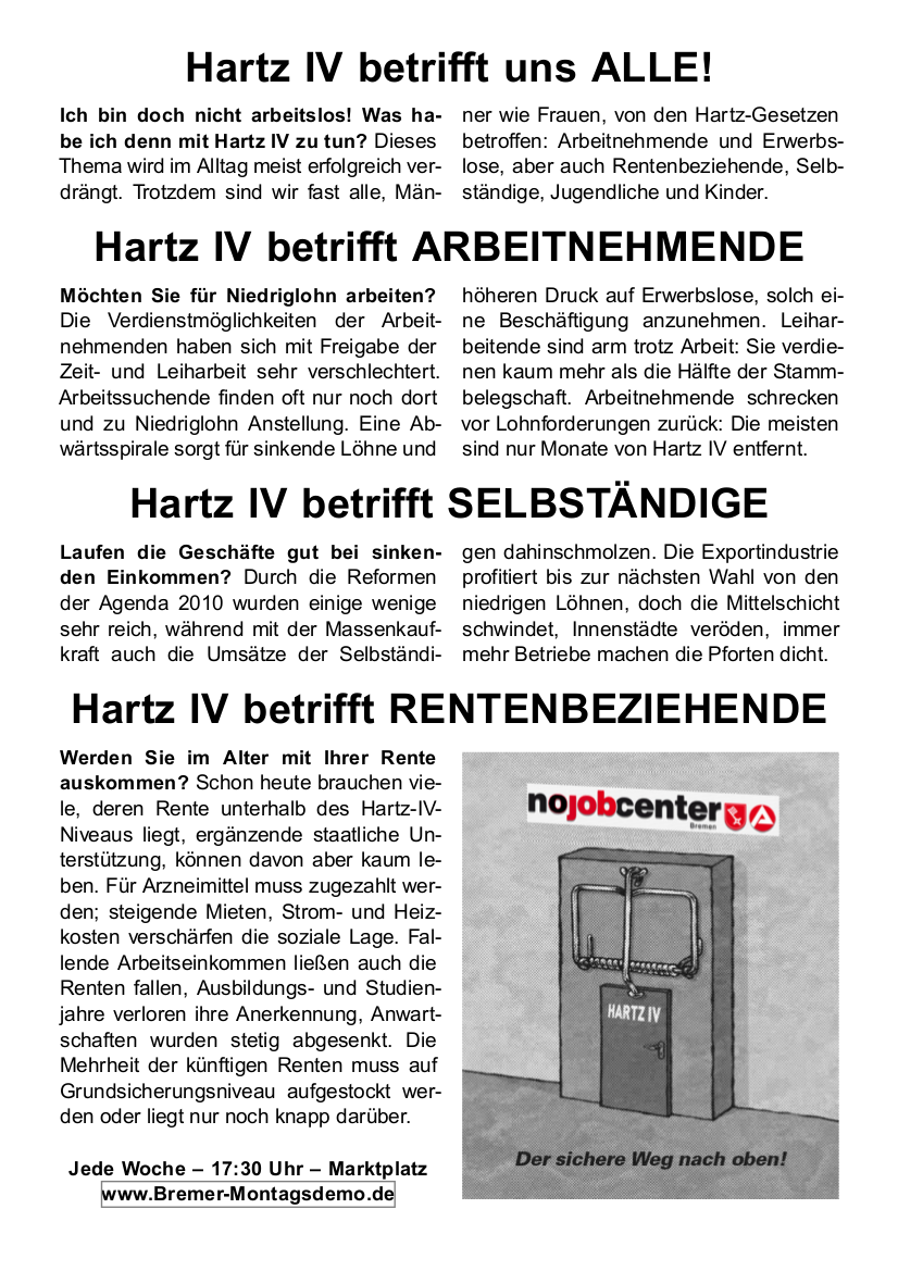 Deutschland besitzt kein funktionierendes soziales Netz mehr. Der Staat hat aber den Verfassungsauftrag, es zu knüpfen! In Bremen ist laut Senatsbericht mittlerweile schon knapp jede(r) Vierte arm. So darf es nicht bleiben! Ob Arbeitslose (durch Hartz IV), Arbeitnehmende (durch Hartz I mit Zeit- und Leiharbeit), Rentenbeziehende (durch Grundsicherung auf Hartz-IV-Niveau) oder Selbständige (durch geringere Massenkaufkraft infolge der neoliberalen Sparpolitik): Wir alle sind von den Hartz-Gesetzen betroffen! Wer sich darüber genauso empört wie wir, ist jeden Montag herzlich zur Teilnahme an unserer Demonstration eingeladen.